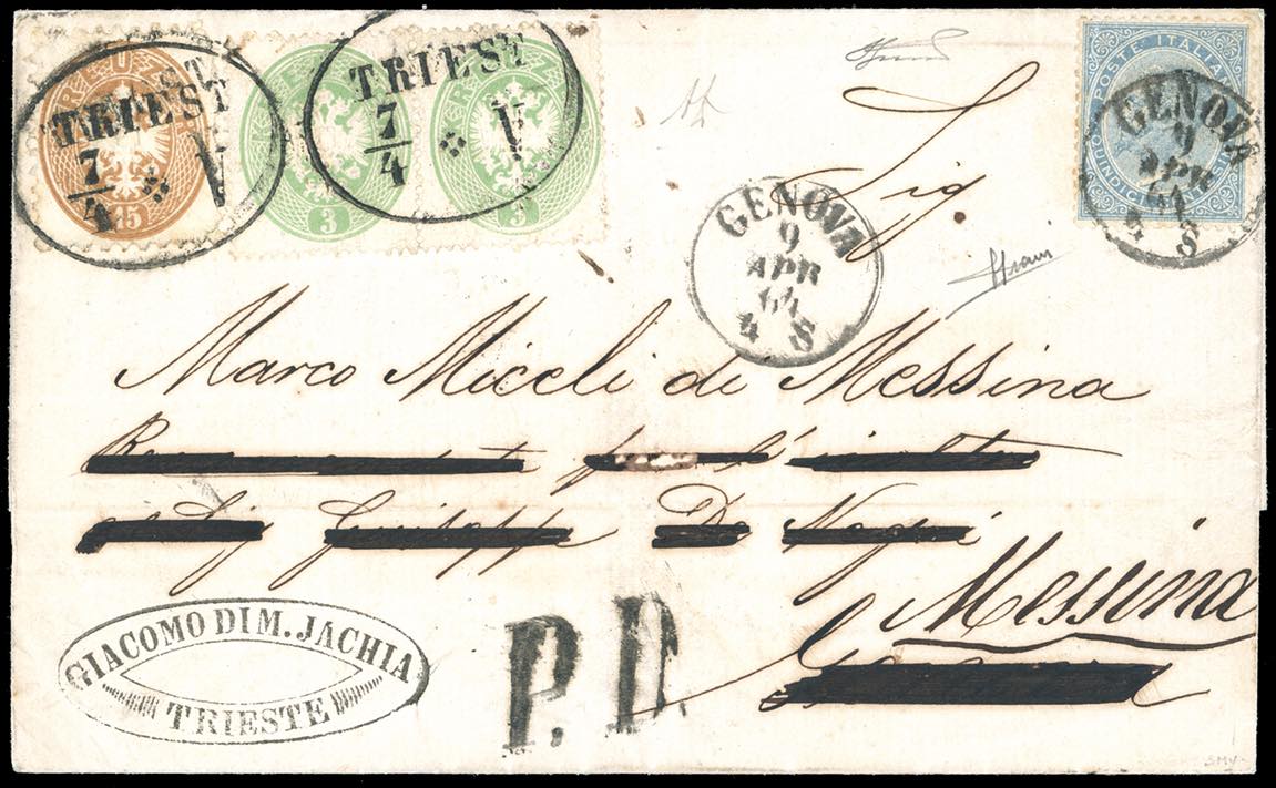 1864 - 3 kr. verde, dent. 14, coppia, 15 kr. bistro, dent. 9 1/2 (Austria 23,31), su lettera da Trieste 7/4/1864 a Genova, dove venne riaffrancata con 15 cent. De La Rue (L18), in data 9/4/1864 prima di essere rispedita a Messina. Interessante e non comune. A.Diena, Sorani, Ferrario.