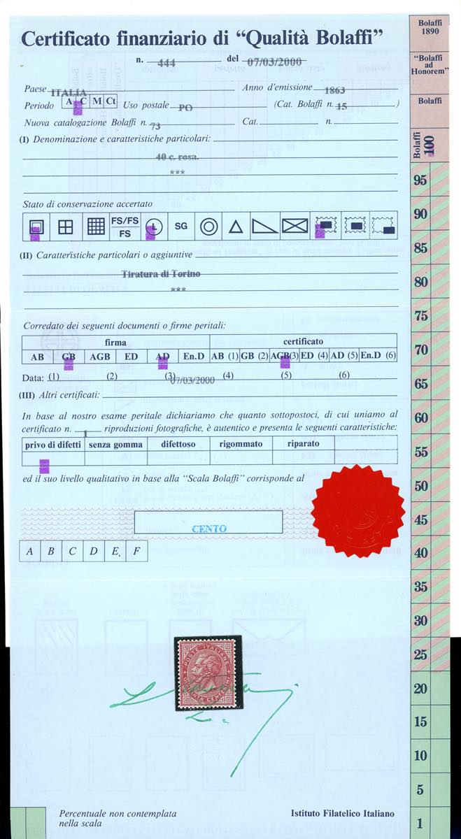 1866 - 40 cent. De La Rue, tiratura di Torino (T20), nuovo, gomma originale, lievissima traccia di linguella, perfetto. Splendido per freschezza e centratura. Molto raro in queste condizioni qualitative. G.Bolaffi, A.Diena, cert. Finanziario Bolaffi 100%.