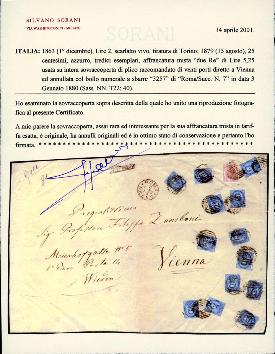 1880 - 2 lire De La Rue, tiratura di Torino, in affrancatura mista con 25 cent. Umberto I, 13 esemplari (T22,40), ottimo stato, su frontespizio di busta raccomandata di 20 porti da Roma 3/1/1880 a Vienna, in Austria. Affrancatura mista "due Re" eccezionale ed unica, impreziosita dall'uso dell'alto valore di Vittorio Emanuele II. Ferrario, cert. Sorani.