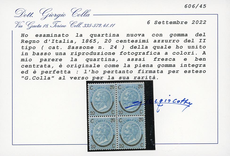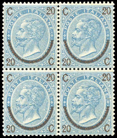 1865 - 20 cent. su 15 cent. Ferro di cavallo, II tipo (24), blocco di quattro, buona centratura, gomma originale integra, perfetto. Estremamente raro. A.Diena, cert. Colla (cat.Sassone € 160.000/220.000).