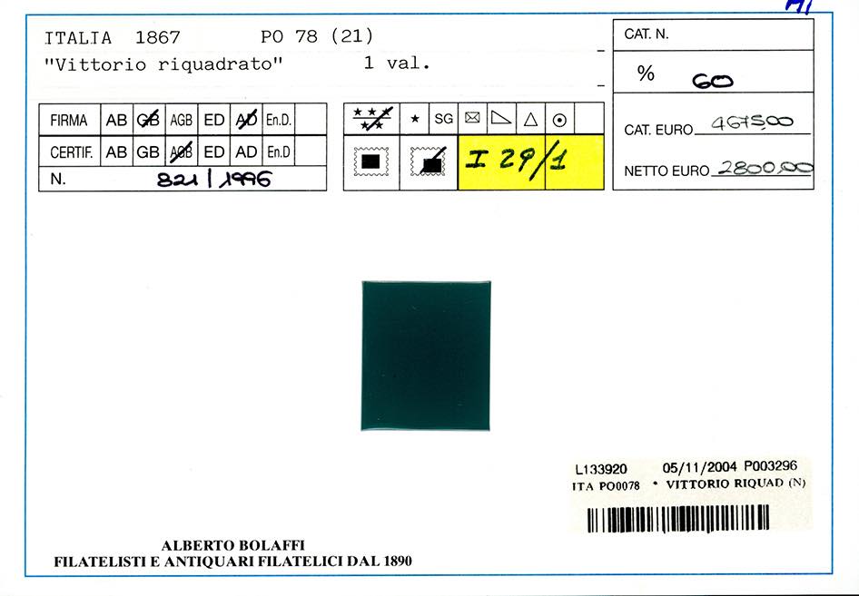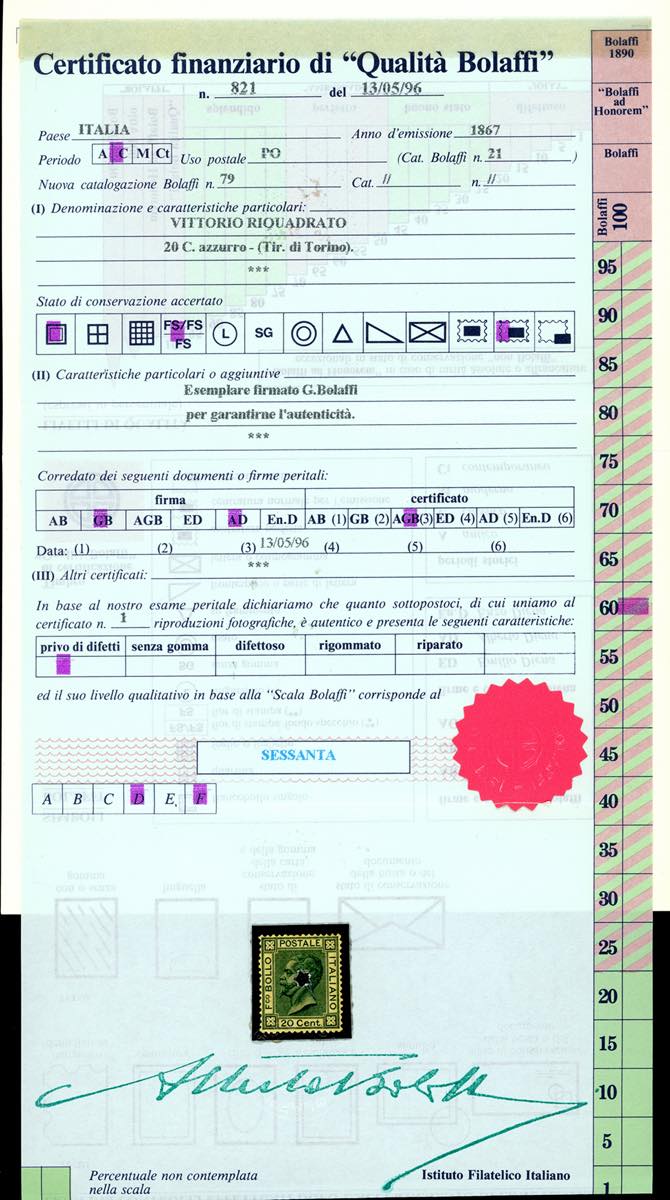 1867 - 20 cent. azzurro, tiratura di Torino (T26), nuovo, gomma originale integra, perfetto. Molto bello e ben centrato. G.Bolaffi, A.Diena, cert. Finanziario Bolaffi 60%.
