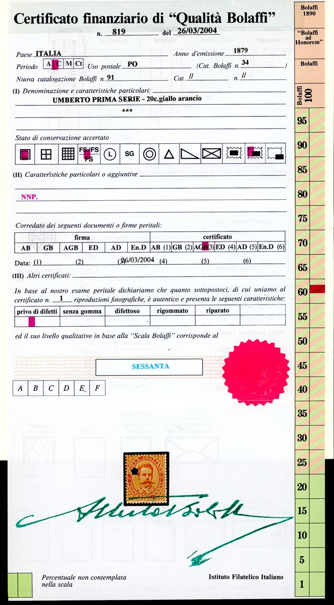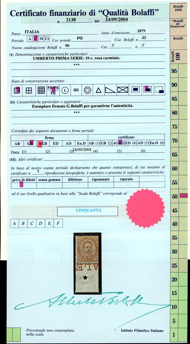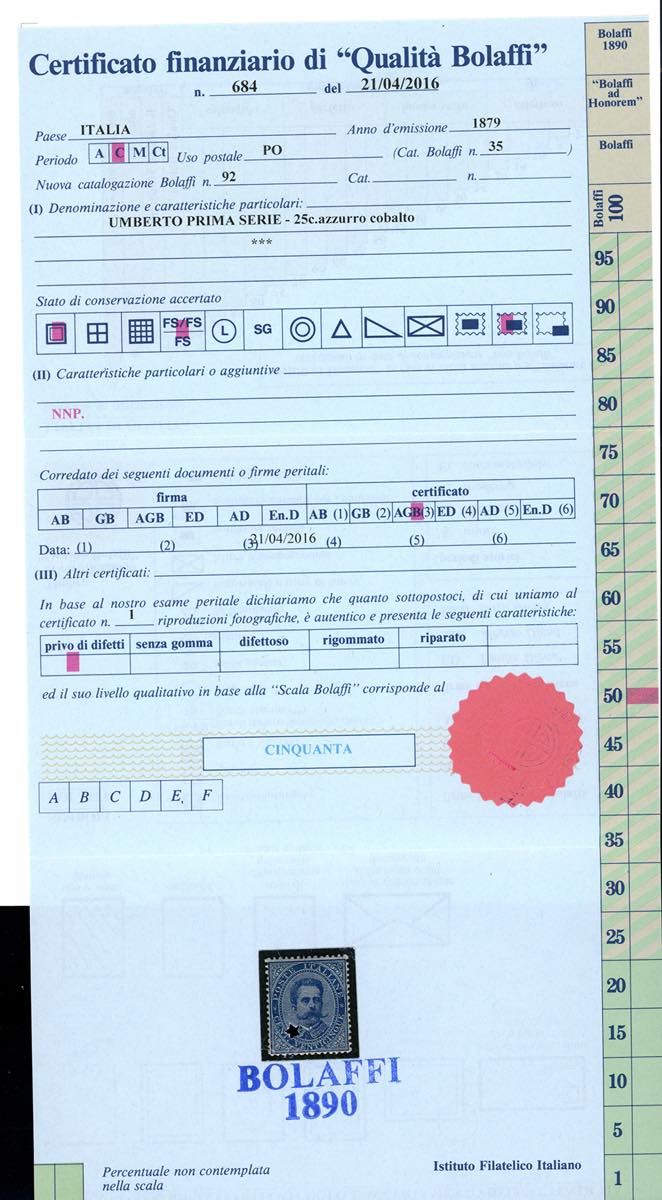 1879 - Umberto I, prima emisssione, serie completa (37/43), nuovi, gomma originale integra, perfetto. Freschissimi. Il 10, 20 e 25 cent. con certificati Finanziari Bolaffi 60%, 50% e 50%.