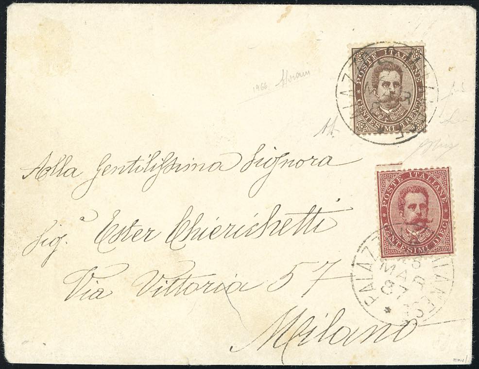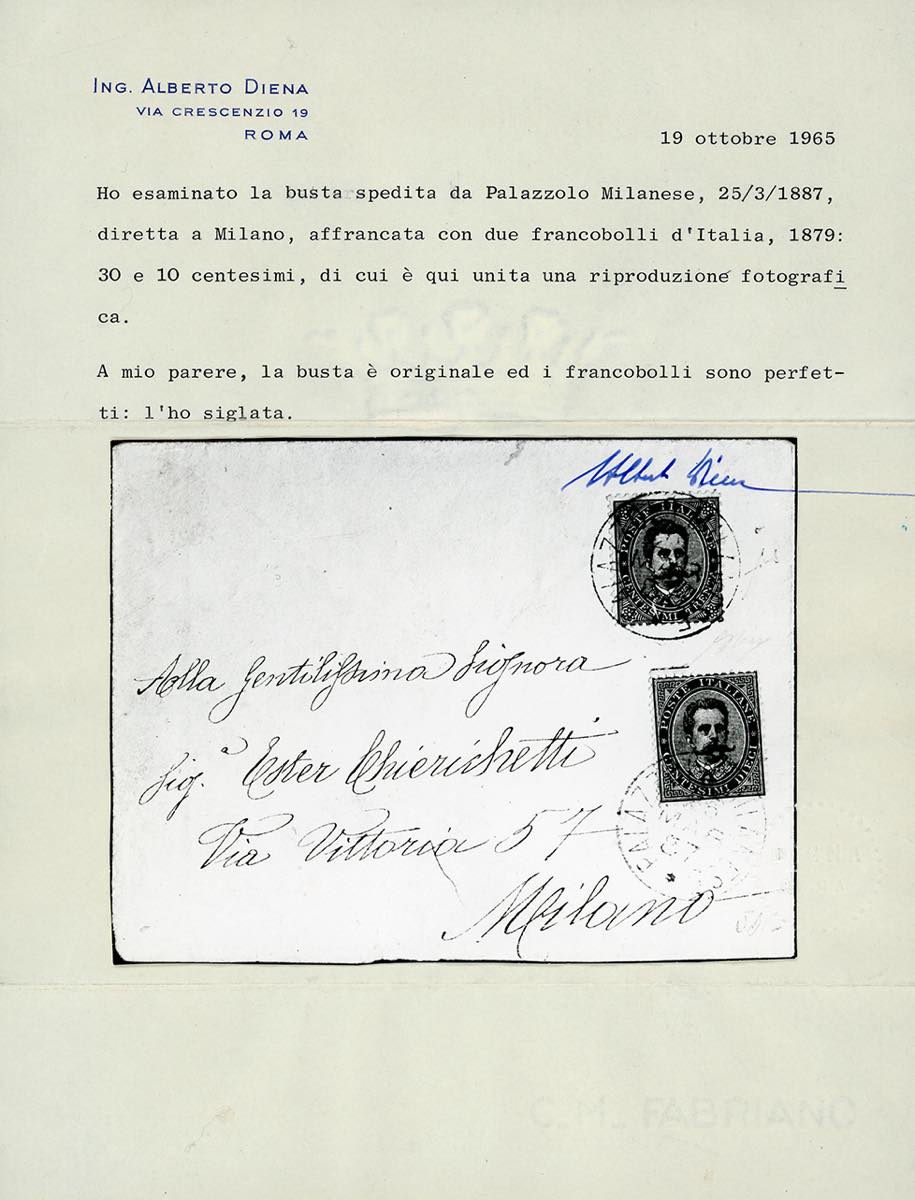 1887 - 30 cent. e 10 cent. Umberto I (41,38), perfetti, su busta da Palazzolo Milanese 26/3/1887 a Milano. Splendida e rara! G.Oliva, Fiecchi, Sorani, cert. A.Diena e Raybaudi.