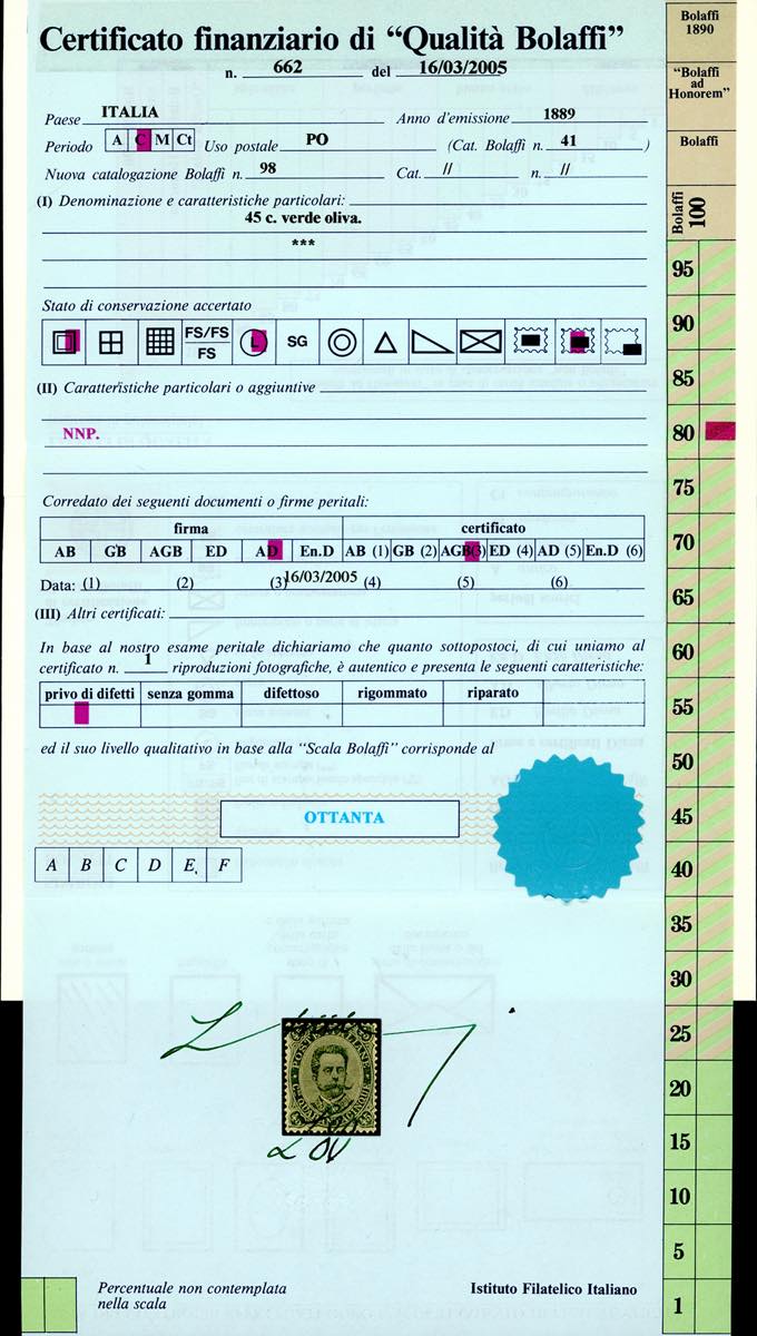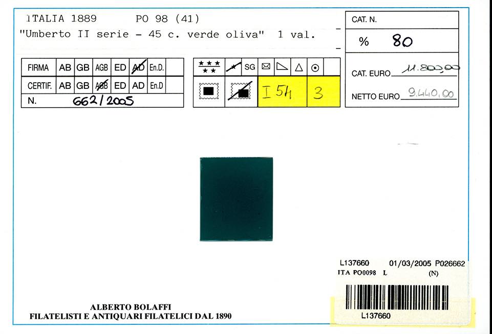 1889 - 45 cent. verde oliva (46), nuovo, gomma originale, lievissima traccia di linguella, perfetto e ben centrato. Molto bello. A.Diena, cert. Finanziario Bolaffi 80%.