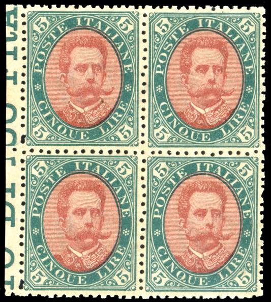 1889 - 5 lire verde e carminio Umberto I (49), ottima centratura, blocco di quattro, piccolo bordo di foglio, gomma originale integra, perfetto. Ferrario.