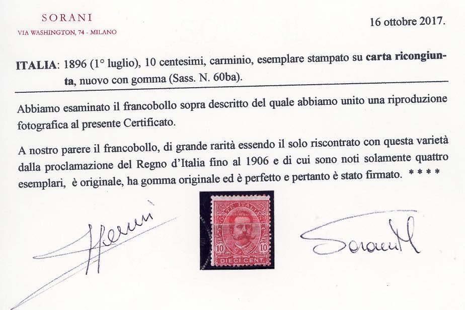 1896 - 10 cent. carminio, stampa su carta ricongiunta (60ba), nuovo, gomma originale, lieve traccia di linguella, perfetto. Solo 4 ... Leggi tutto