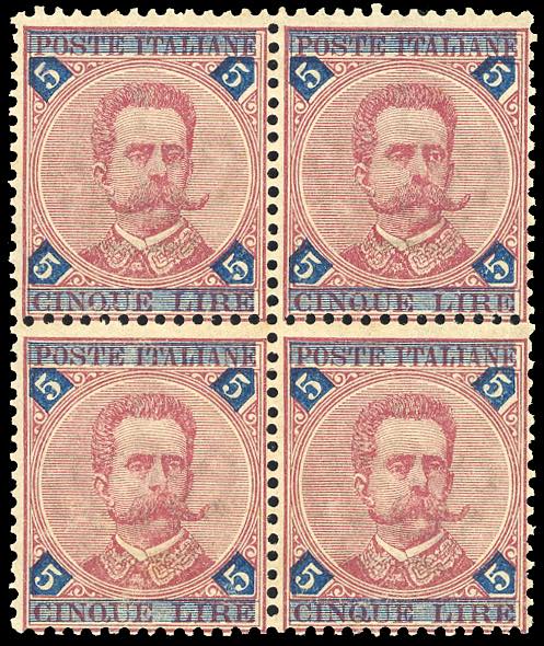 1891 - 5 lire carminio e azzurro (64), blocco di quattro, gomma originale integra, perfetto. Ferrario.