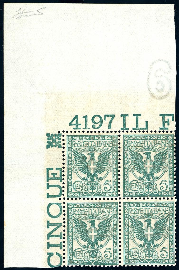1901 - 5 cent. verde Floreale, blocco di quattro angolo di foglio integrale superiore sinsitro con numero di tavola 4197 (70), nuovo, gomma originale integra, perfetto. Splendido e molto raro, qualità lusso. Cert. Ferrario.
