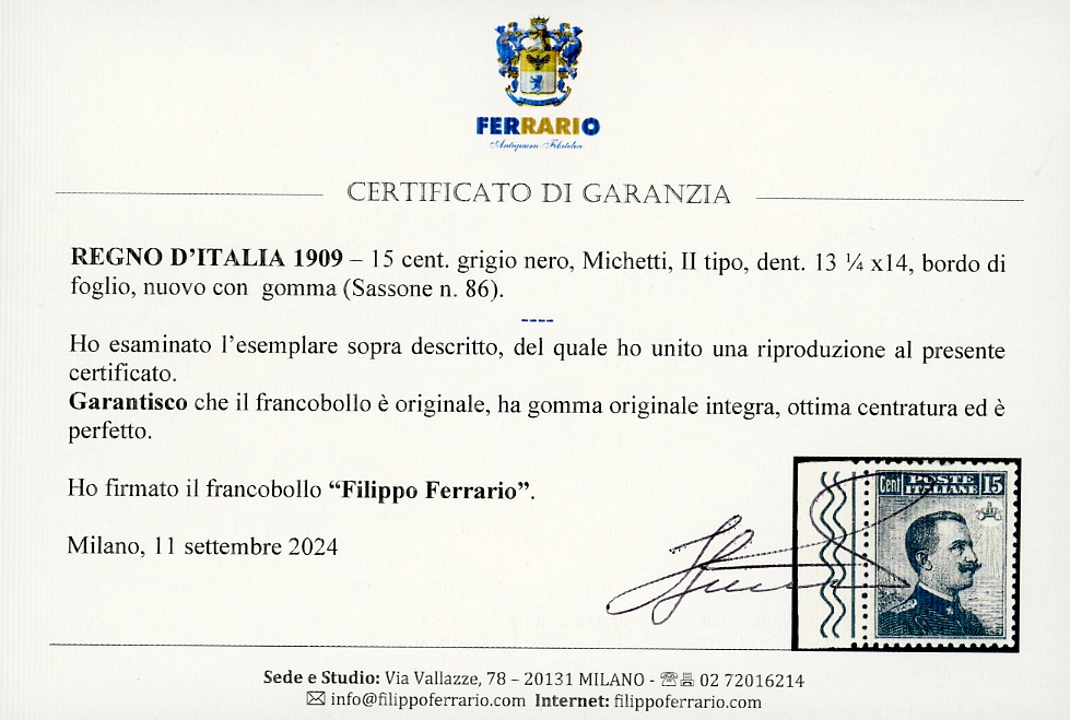 1909 - 15 cent. Michetti, I tipo (86), ottima centratura, bordo di foglio, gomma originale integra, perfetto. Splendido, qualità lusso. Cert. Ferrario.
