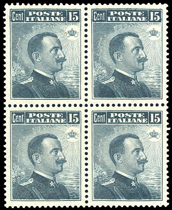 1911 - 15 cent. Michetti, III tipo (96), ottima centratura, blocco di quattro, gomma originale integra, perfetto. Molto bello. Ferrario.