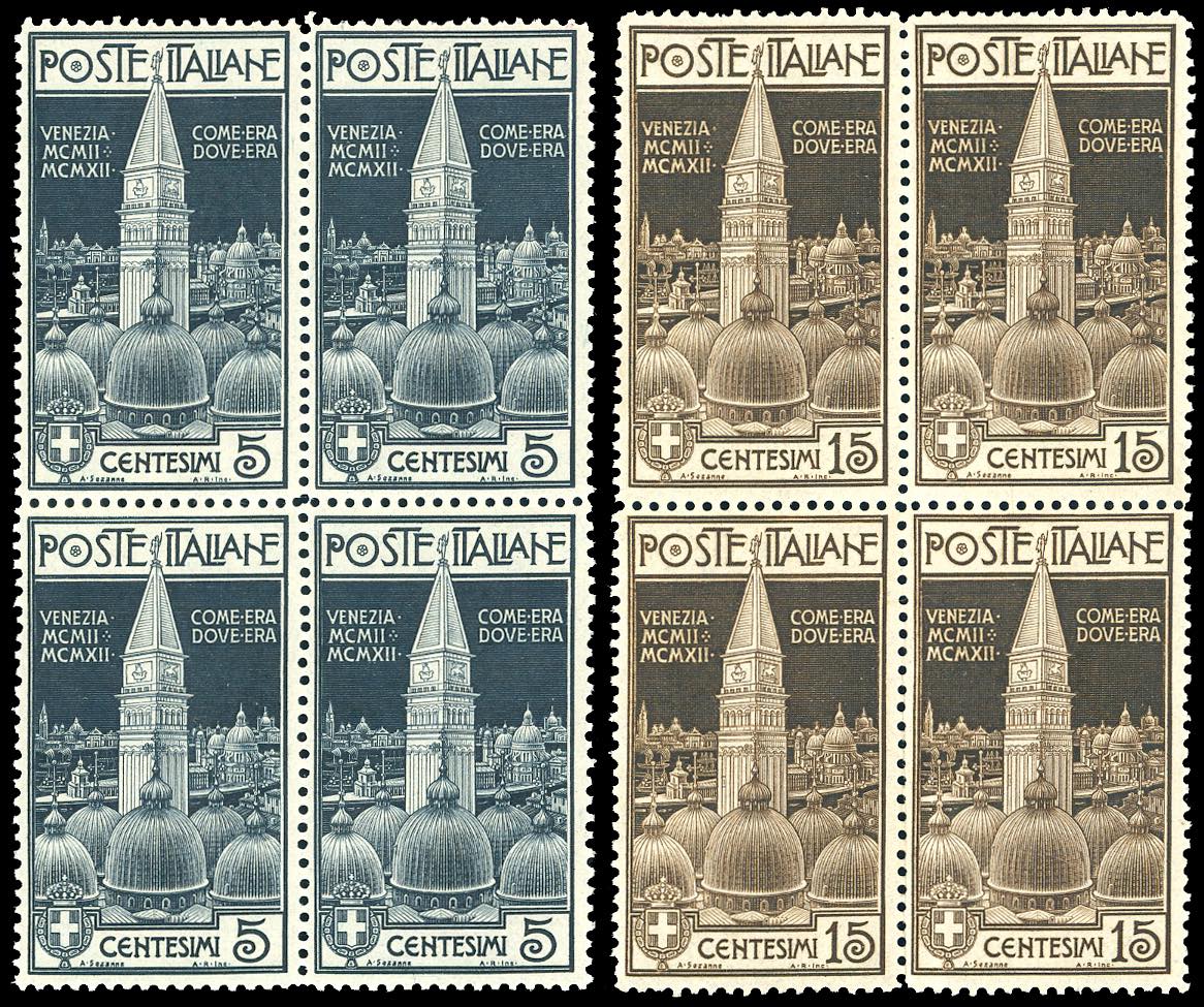 1912 - Campanile di San Marco, serie completa (97/98), ben centrati, blocchi di quattro, gomma originale integra, perfetti. Ferrario.