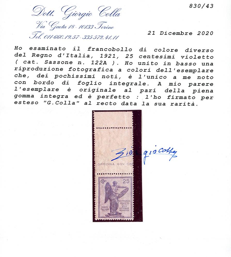1921 - 25 cent. violetto Vittoria, colore diverso (122A), bordo di foglio integrale superiore, nuovo, gomma originale integra, perfetto. Splendido e molto raro, il migliore dei pochi esistenti. Cert. Colla.