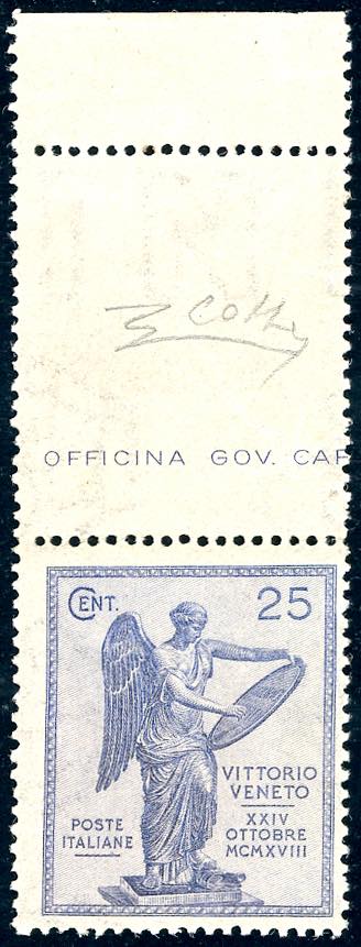1921 - 25 cent. violetto Vittoria, colore diverso (122A), bordo di foglio integrale superiore, nuovo, gomma originale integra, perfetto. ... Leggi tutto