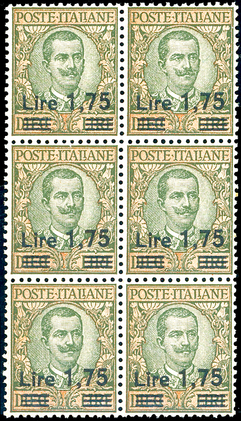 1925 - 1,75 lire su 10 lire Floreale (182), ottima centratura, blocco di sei, gomma originale integra, perfetto. Molto bello. Ferrario.