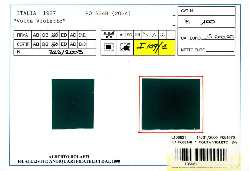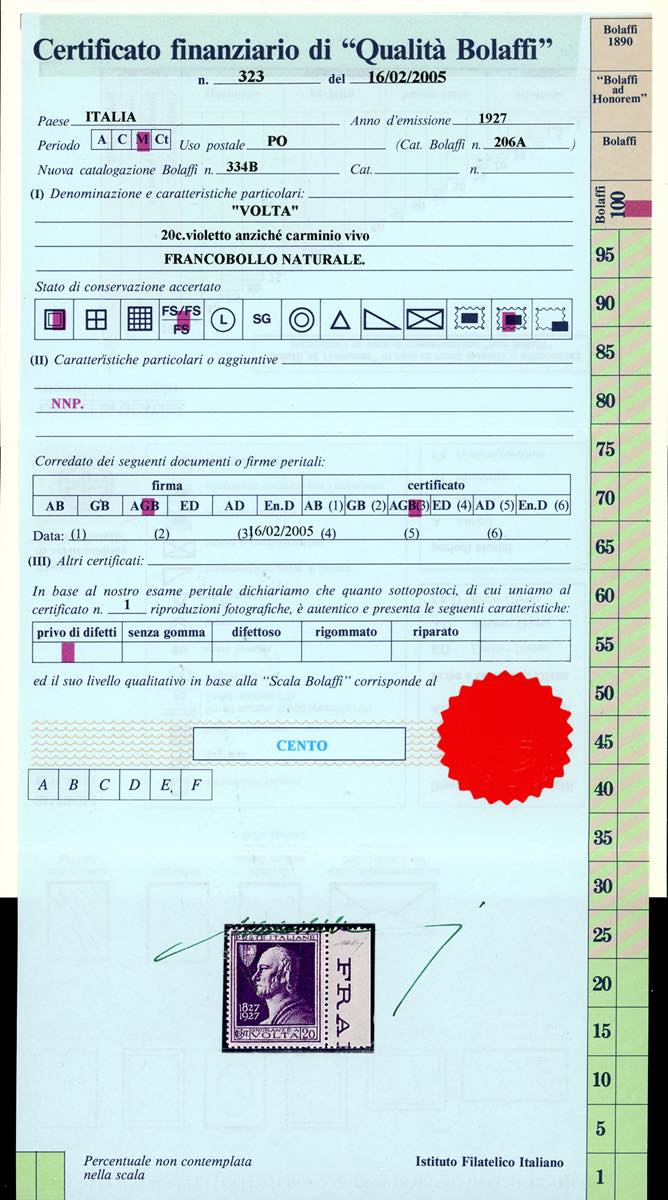 1927 - 20 cent. Volta violetto, errore di colore (210A), bordo di foglio, gomma originale integra, perfetto e molto fresco. Molto bello e raro. Cert. Finanziario Bolaffi 100%. (Cat. Sassone € 9.750/14.625).