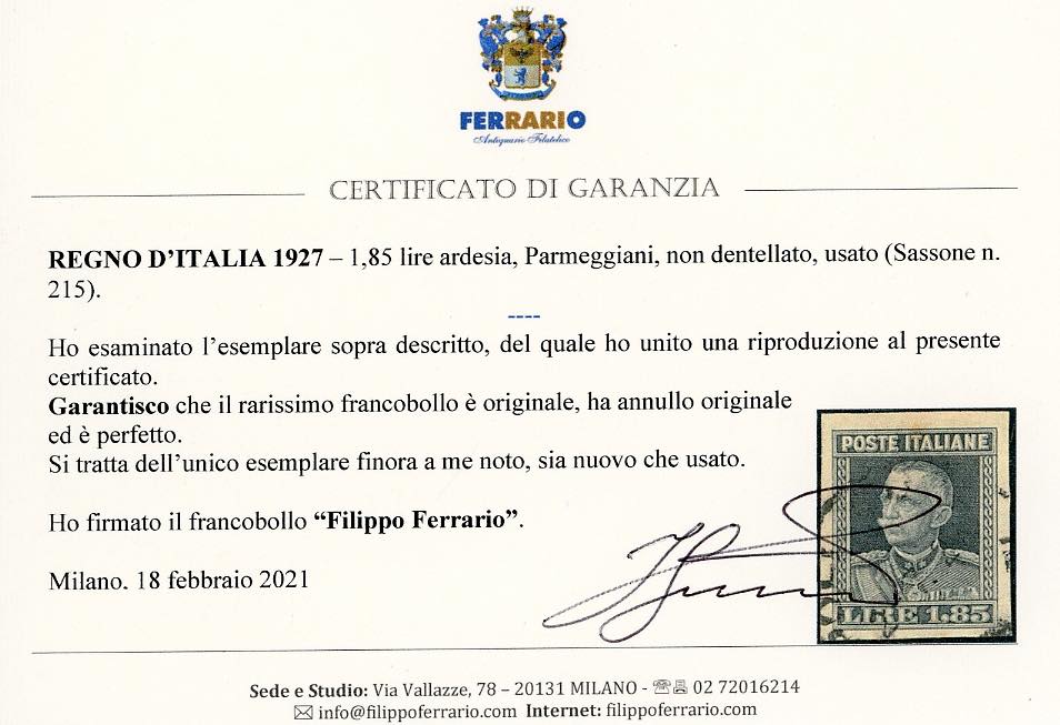 1927 - 1,85 lire Parmeggiani, non dentellato (215c), usato, perfetto. UNICO ESEMPLARE NOTO, sia nuovo che usato, di questa varietà. Cert. Oro Raybaudi, Ferrario.