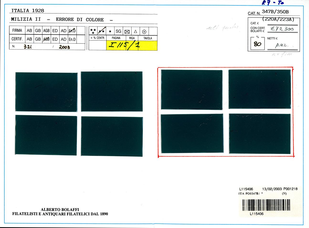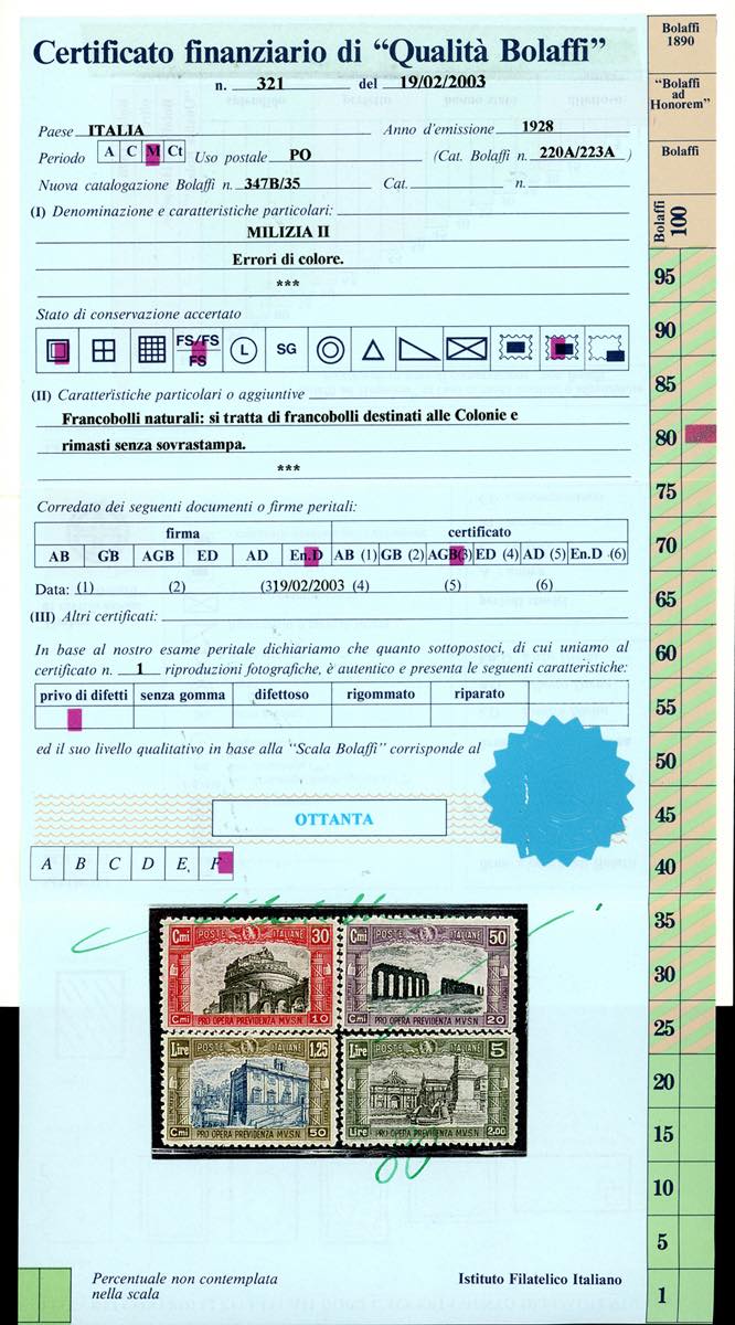 1928 - Milizia, seconda emissione, ERRORE DI COLORE, serie completa (220A/223A), nuovi, gomma originale integra, perfetti. Bellissimi e molto rari. Tiratura 50 serie. Enzo Diena, cert. Finanziario Bolaffi 80%.
