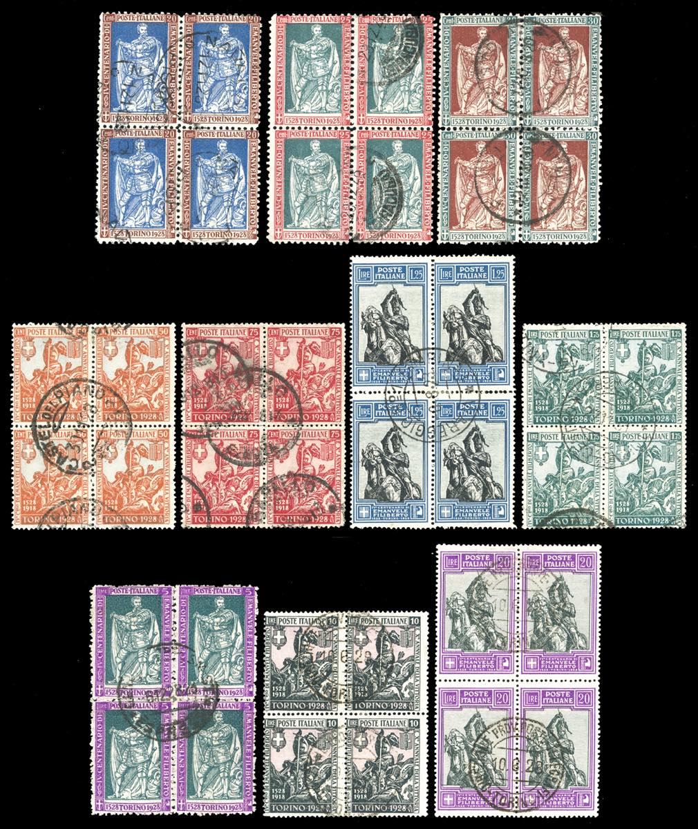 1928 - Emanuele Filiberto, serie di 10 valori con le dentellature più comuni (S.49), blocchi di quattro, usati, perfetti. Molto rari. Cert. E.Diena e Ferrario per i tre alti valori.