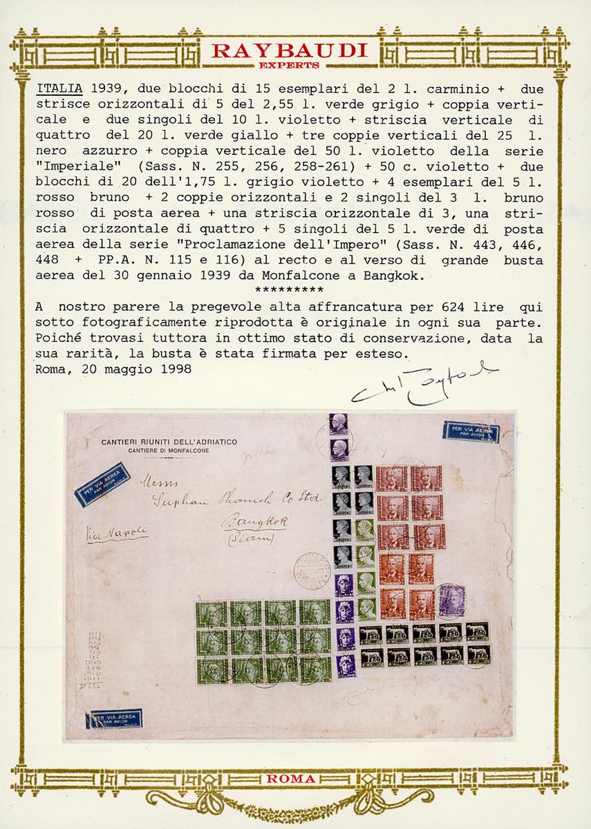 1939 - 50 lire due esemplari, 25 lire sei esemplari, 20 lire quattro esemplari, 10 lire quattro esemplari, 2,55 lire dieci esemplari, 2 lire due blocchi di quindici esemplari, Imperiale, 50 cent., 1,75 lire due blocchi di venti esemplari, 5 lire quattro esemplari, 3 lire posta aerea sei esemplari, 5 lire 12 esemplari, Impero (258/261,256,255,443,446,448,A115,A116), complessivamente in ottimo stato di conservazione, in affrancatura fronte/retro su aerogramma da Monfalcone 30/1/1939 a Bangkok, in Siam. Spettacolare ed unica affrancatura multipla, per complessive 624 lire, composta dagli alti valori dell'Imperiale, inconsueta destinazione. Cert. Oro Raybaudi.