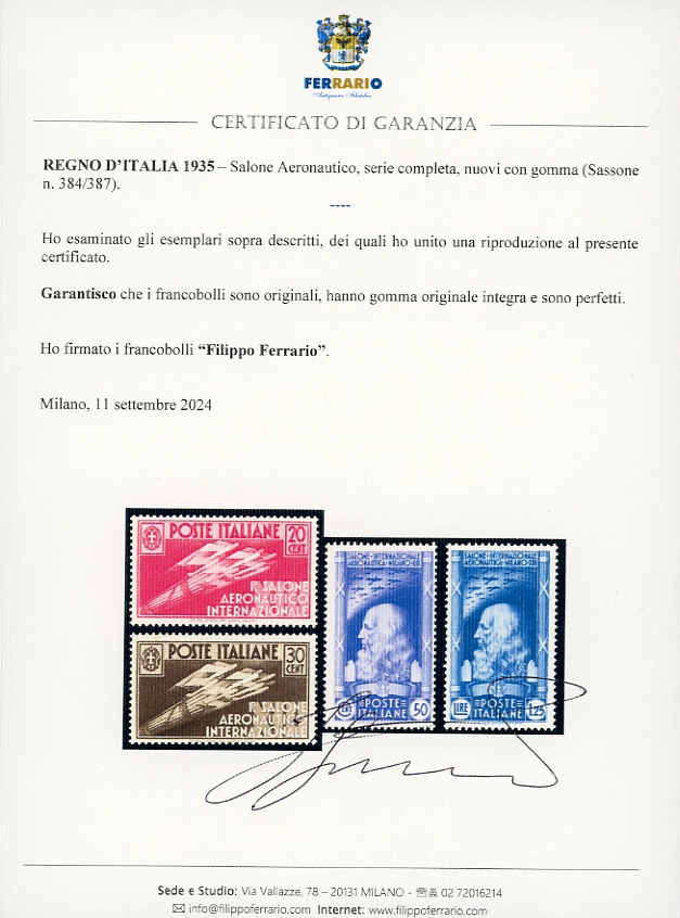 1935 - Salone Aeronautico, serie completa (384/387), gomma originale integra, perfetti. Cert. Ferrario.
