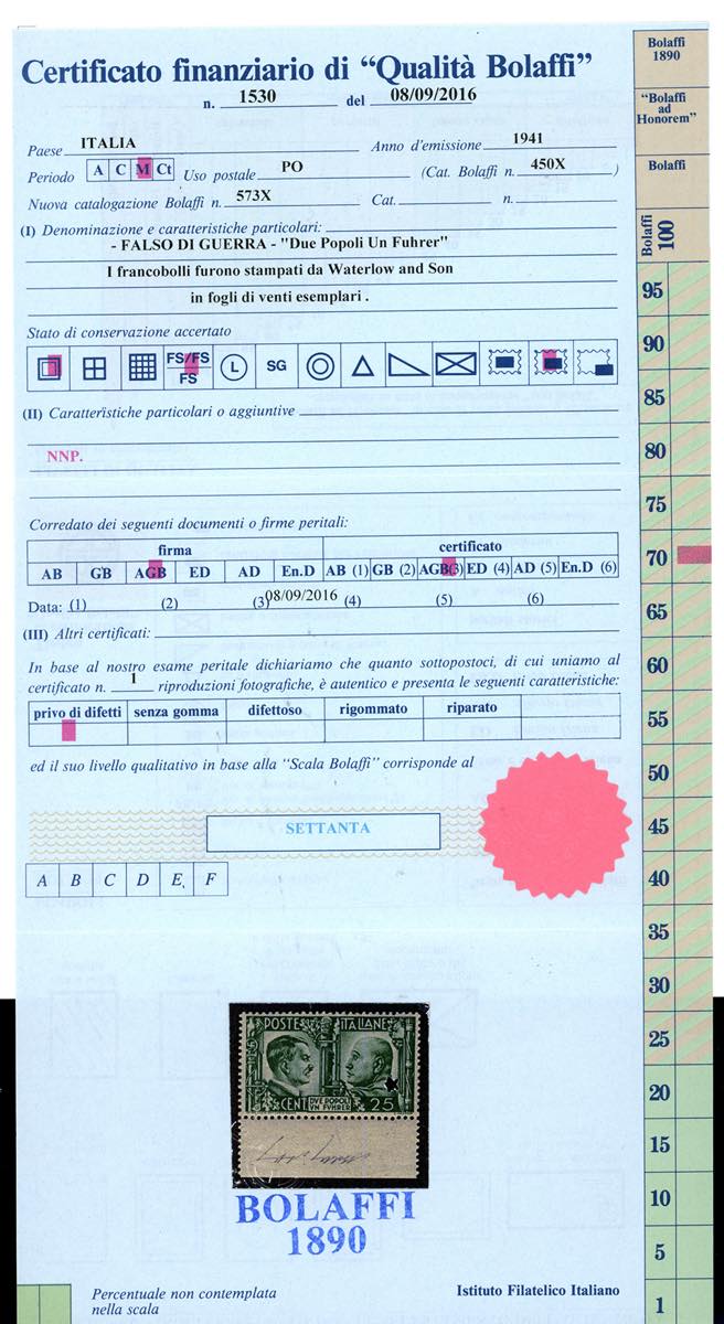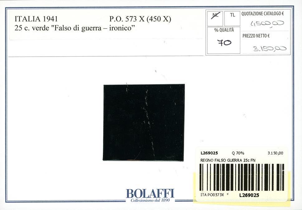 1941 - 25 cent. verde, imitazione di guerra, Alleanza Roma-Berlino (IG454), bordo di foglio, gomma originale integra, perfetto. Molto bello e raro. Cert. Finanziario Bolaffi 70%.