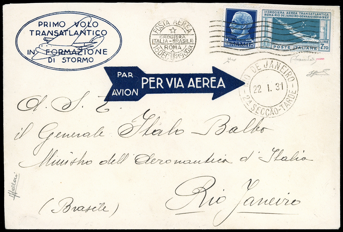 1930 - 7,70 lire Crociera Balbo, 1,25 lire Imperiale (A25,253), perfetti, su aerogramma da Roma 15/12/1930 a Rio de Janiero, senza le firme dei piloti, bollo speciale della Crociera. Chiavarello, cert. Ferrario.