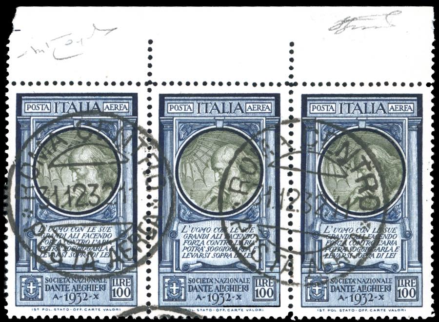 1932 - 100 lire Dante (41), striscia orizzontale di tre, bordo di foglio, usata, perfetta. Rara. Ferrario, cert. Raybaudi.