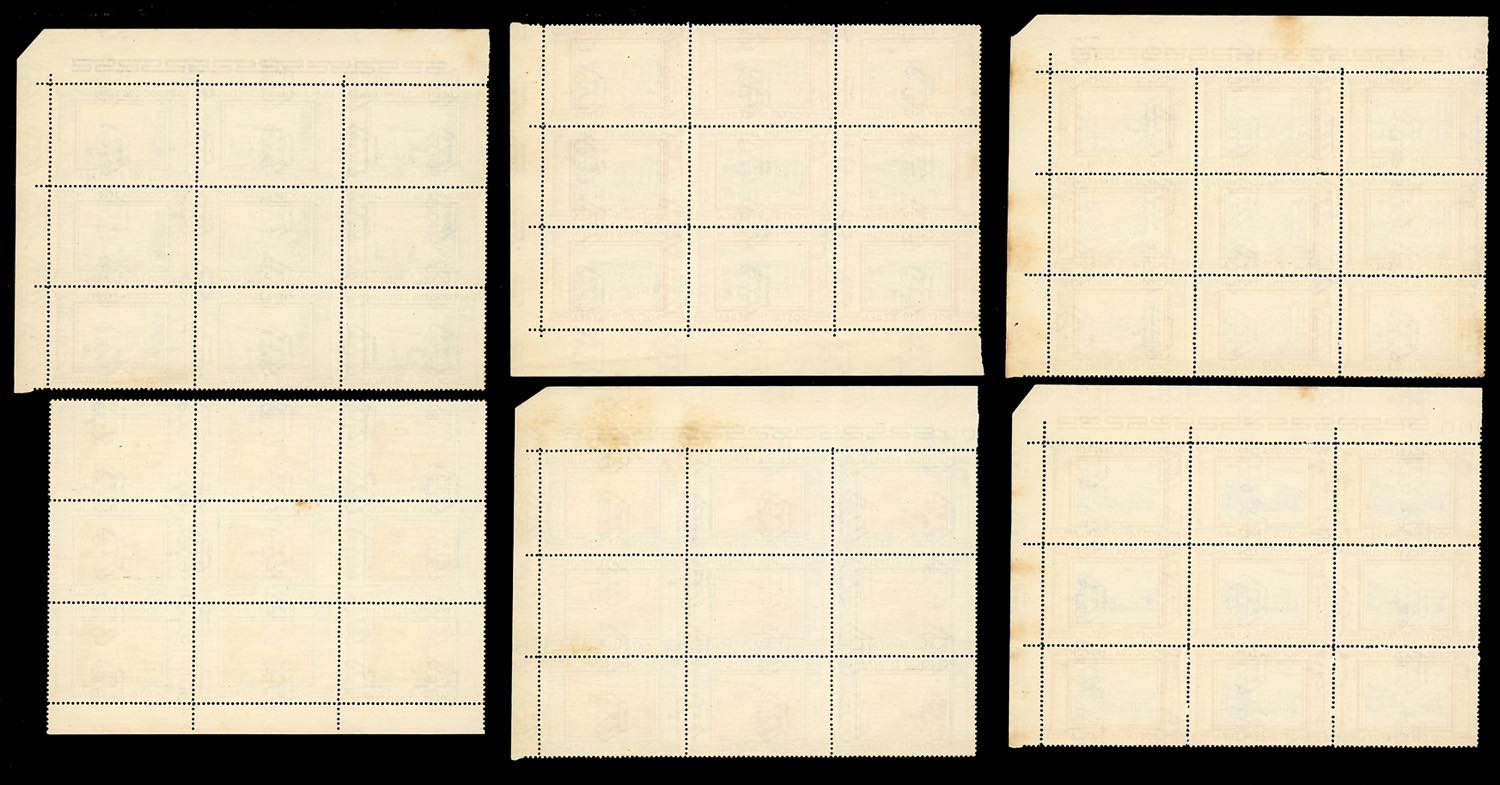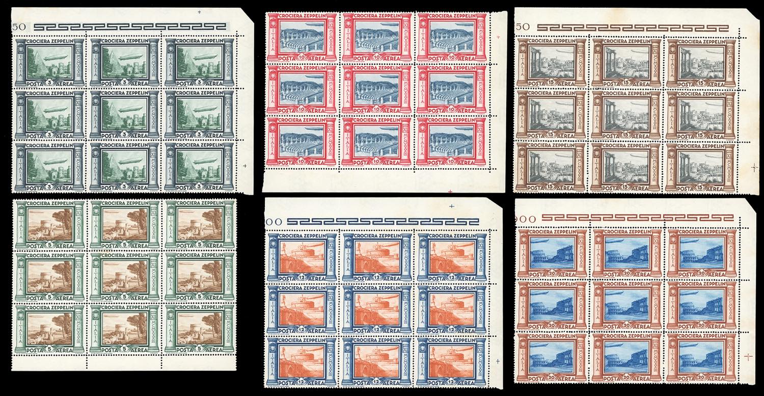 1933 - Zeppelin, serie completa (45/50), blocchi di nove esemplari, angolo/bordo di foglio, gomma originale integra, cinque esemplari con lievi ossidazioni, sette serie complete perfette.