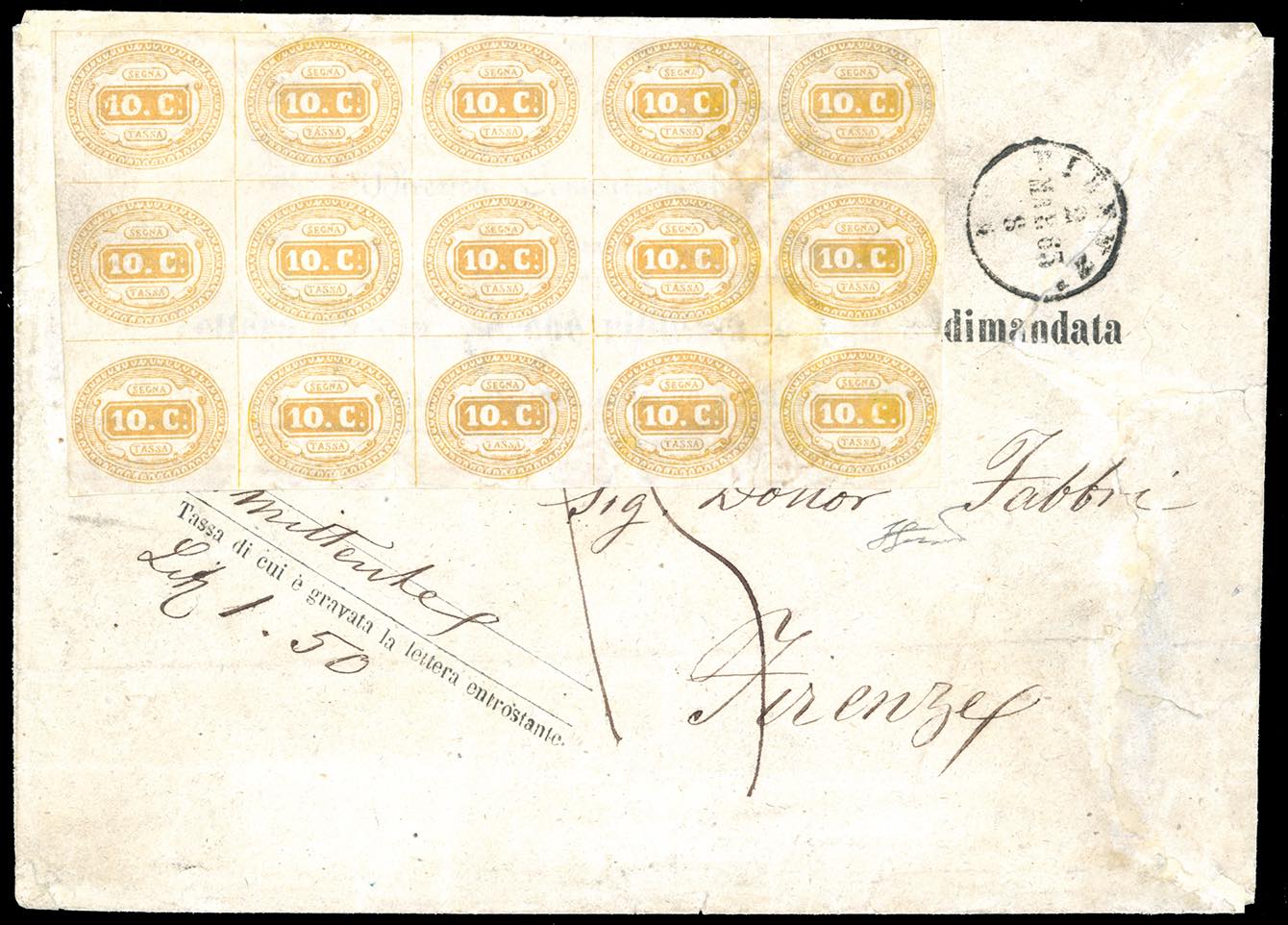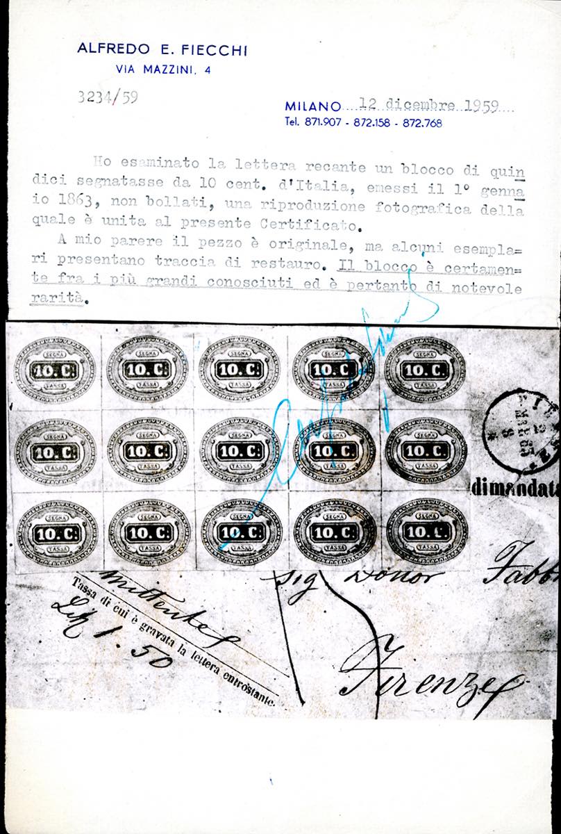 1863 - 10 cent. giallo (1), blocco di 15 esemplari, alcuni dei quali elegantemente restaurati, su busta contenente una lettera aperta perché rifiutata o non richiesta, inviata dalla Direzione compartimentale di Firenze 2/3/1863 per città, tassata 1,50 lire. Tale busta conteneva una lettera di cinque porti tassata (30 cent.x5), che non era stato possibile recapitare e che venne ritornata al mittente per il pagamento della suddetta tassa. Multiplo estremamente raro, uno dei massimi noti, e documento di grande interesse storico postale. Ferrario, cert. Fiecchi.