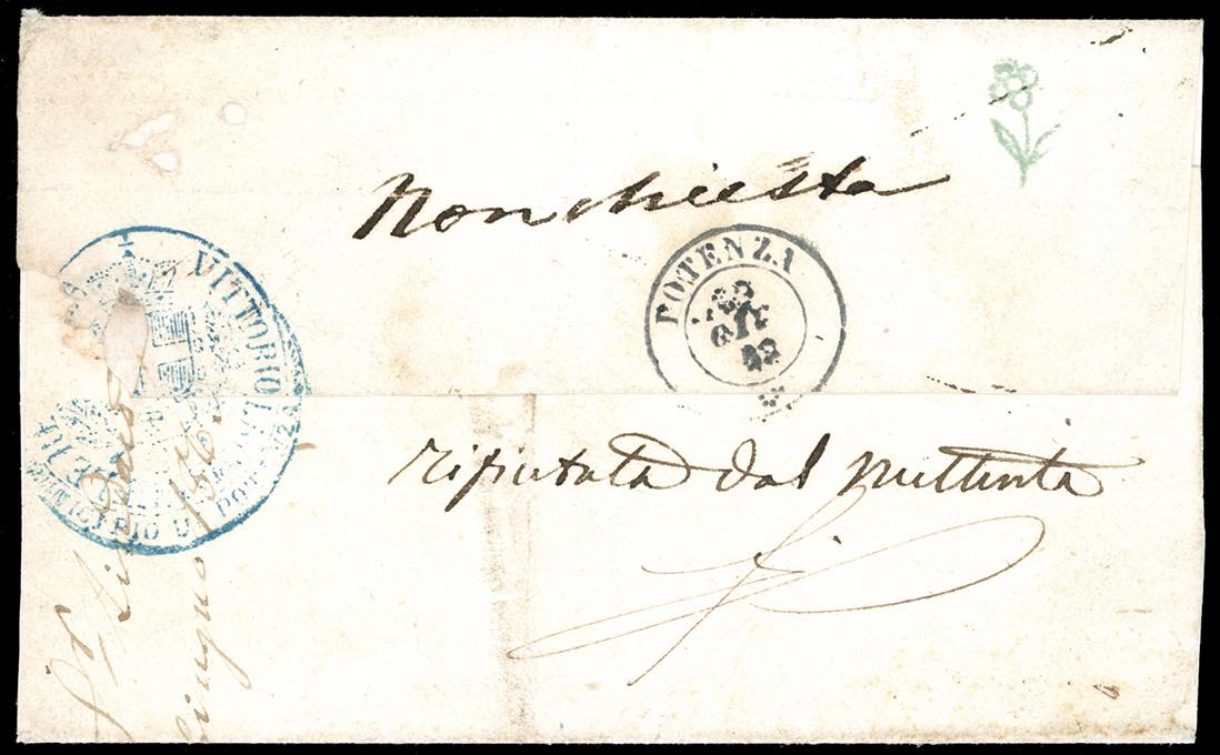 1863 - 10 cent. giallo (1), perfetto, annullato a penna su lettera non affrancata da Potenza 19/6/1863 a Calvello, manoscritto al verso "non chiesta" e "rifiutata dal mittente". Interessante. Turolla, Ferrario.