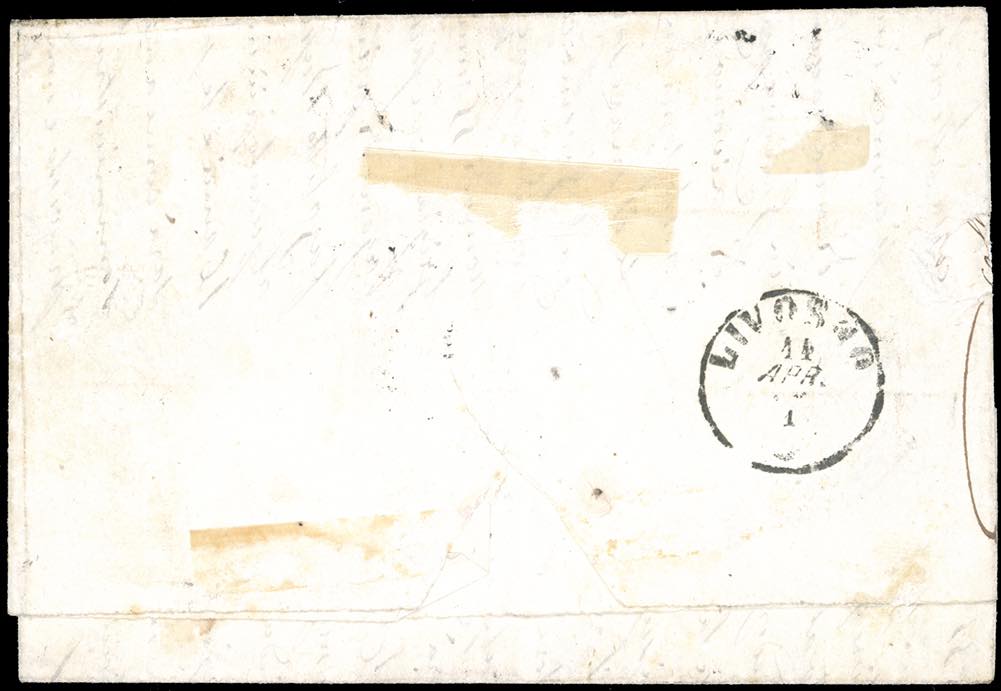 1866 - 10 cent. giallo (1), coppia verticale, buono stato, annullata in arrivo con il bollo ovale di distribuzione, su lettera affrancata con 5 baj rosa carminio (Pontificio 6A), da Roma 13/4/1866 a Livorno, bollo di tassa a tampone "2". Molto raro il bollo di distribuzione come unico annullatore di questo segnatasse. Cert. Ferrario.