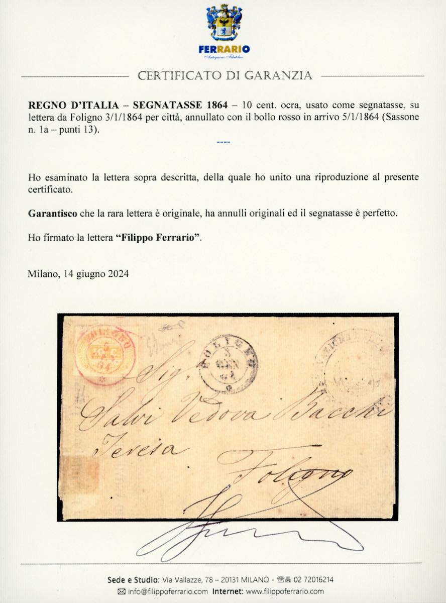 1864 - 10 cent. ocra (1a), perfetto, usato come segnatasse, su lettera da Foligno 3/1/1864 per città, annullato con il bollo rosso di Foligno 5/1/1864 (punti 13). Bella e rara. Emilio e Alberto Diena, cert. Ferrario.