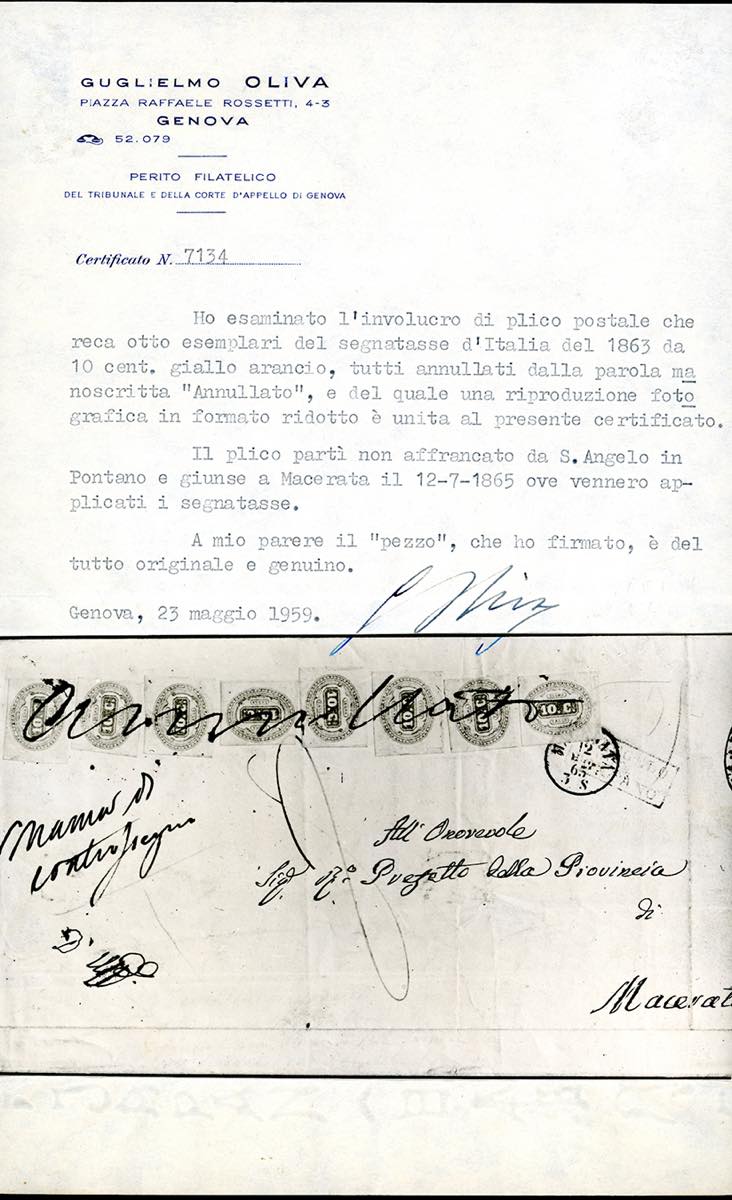 1865 - 10 cent. arancio (1b), otto esemplari, perfetti, su lettera non affrancata da S.Angelo in Pontano a Macerata 12/7/1865, tassata 8. Sul fronte venne manoscritto "manca di contrassegno", ad indicare che la missiva non godeva di franchigia e i segnatasse vennero obliterati con la dicitura manoscritta "annullato". Eccezionale e rarissima affrancatura multipla di questo segnatasse, probabilmente unica con questo annullo. Da esposizione. Cert. G.Oliva e Ferrario.