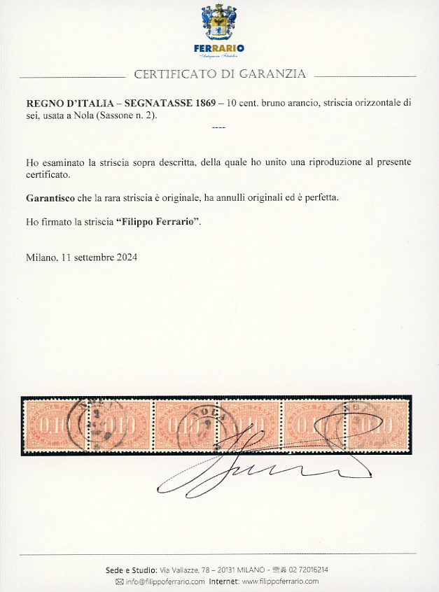1869 - 10 cent. bruno arancio (2), striscia orizzontale di sei, perfetta, usata a Nola. Multiplo estremamente raro. G.Bolaffi, cert. Ferrario.