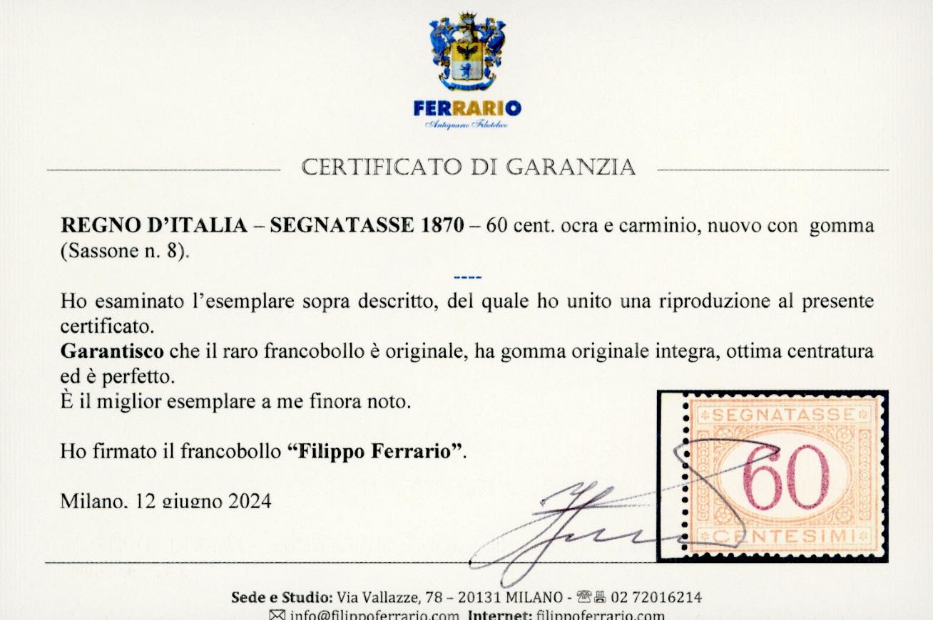 1870 - 60 cent. ocra e arancio (10), ottima centratura, bordo di foglio, gomma originale integra, perfetto e di grande freschezza. Raro e ... Leggi tutto