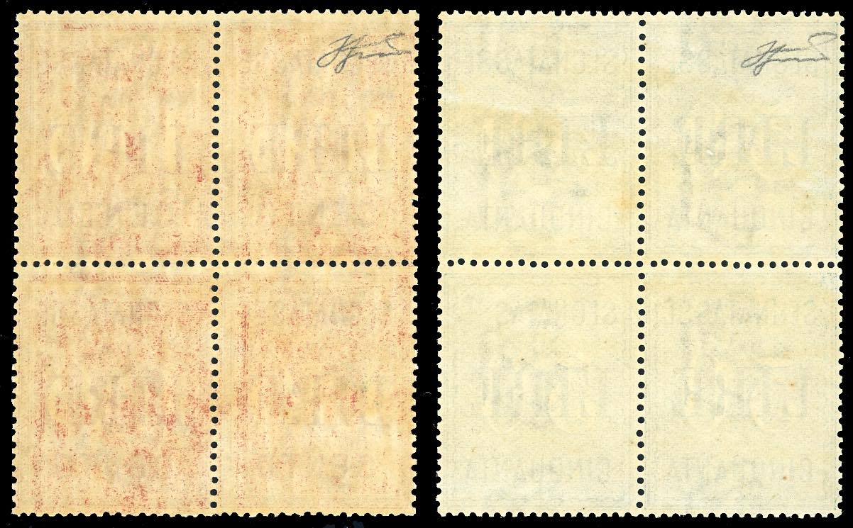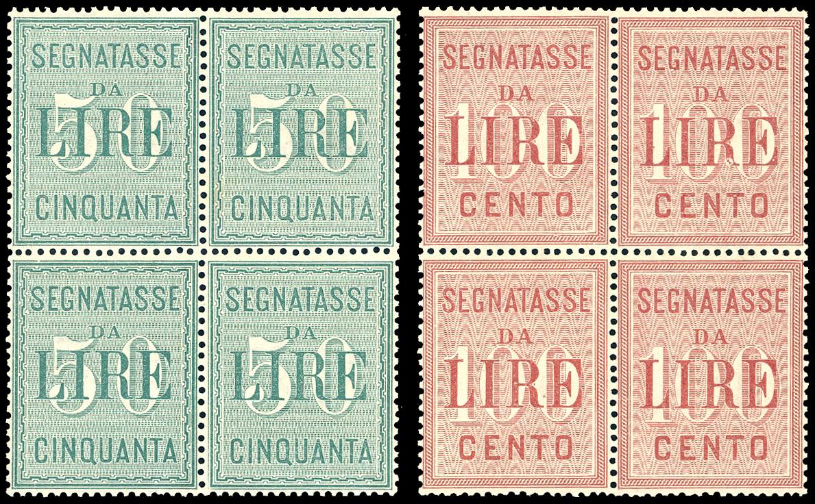 1884 - 50 e 100 lire (15/16), blocchi di quattro, nuovi, gomma originale integra, perfetti e ben centrati. Bellissimi. Cert. Ferrario.