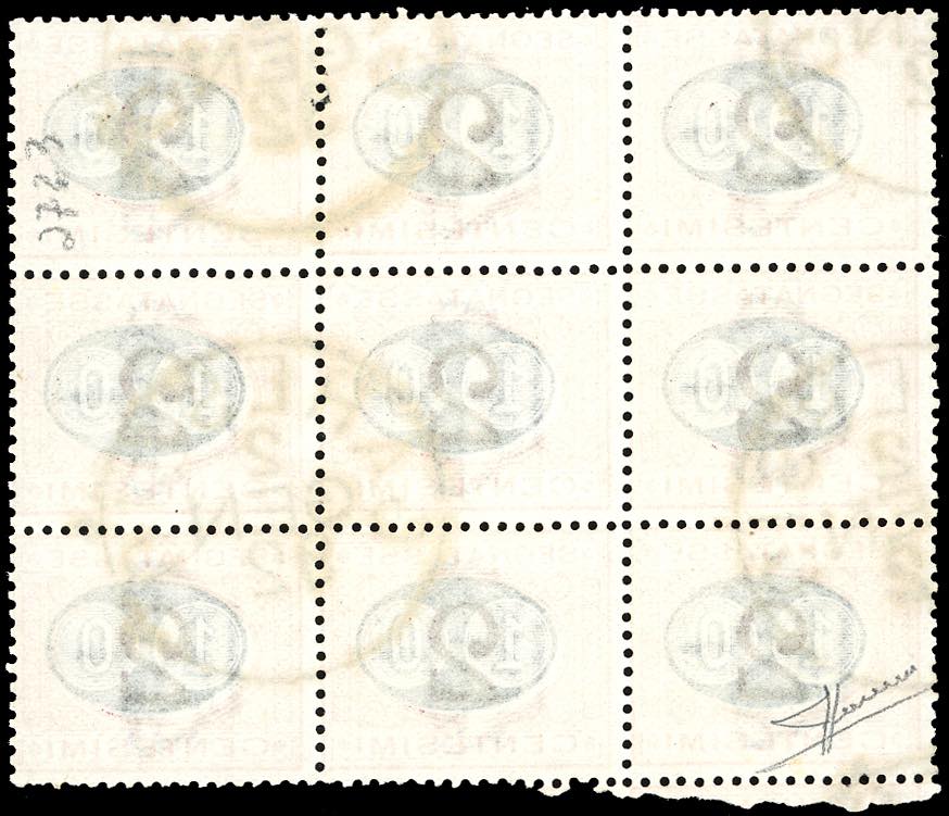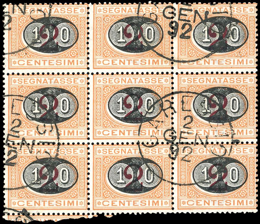 1891 - 10 cent. su 2 cent. Mascherine (17), blocco di nove esemplari usati, perfetto. Rarità, si tratta del massimo multiplo noto usato! ... Leggi tutto