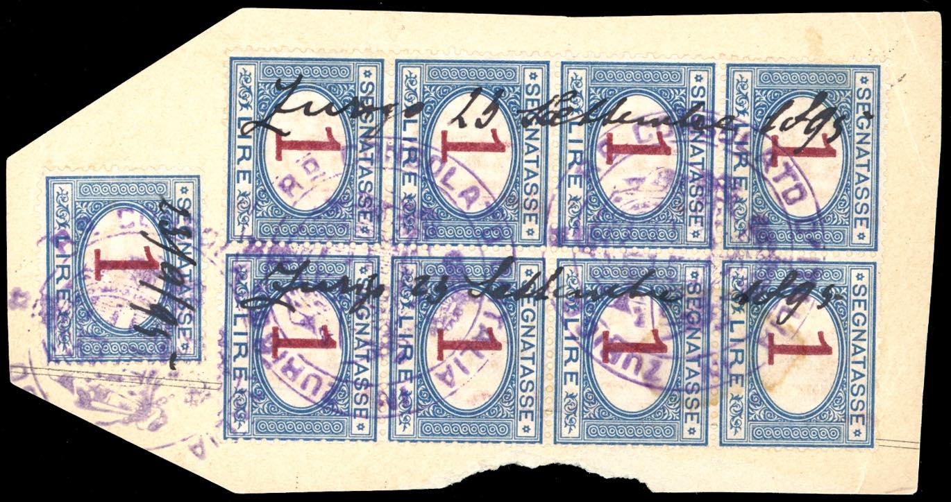 1895 - 1 lira azzurro e carminio (27), blocco di otto e singolo, perfetti, usati con il bollo violaceo del Consolato Italiano a Zurigo, 23/9/1895. Interessante e non comune.