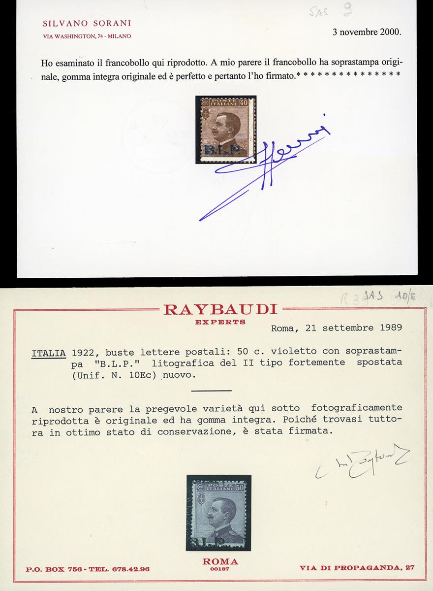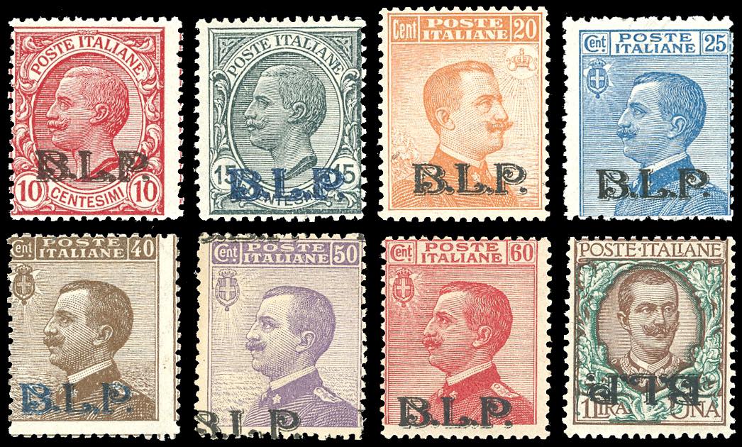 1922/23 - Soprastampa BLP, II tipo, serie completa, l'1 lira con soprastampa capovolta (5/6,7A,8/11,12b), gomma originale integra, perfetti. Raro insieme di ottima qualità. Ferrario per la serie, sei certificati di noti periti per i valori più importanti.