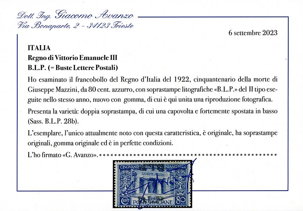 1922 - 80 cent. azzurro Mazzini, doppia soprastampa di cui una capovolta (28b), nuovo, gomma originale, impercettibile traccia di linguella, perfetto. Si tratta dell'UNICO ESEMPLARE finora noto. Rarità dell'intero settore BLP. Fiecchi, cert. Avanzo.