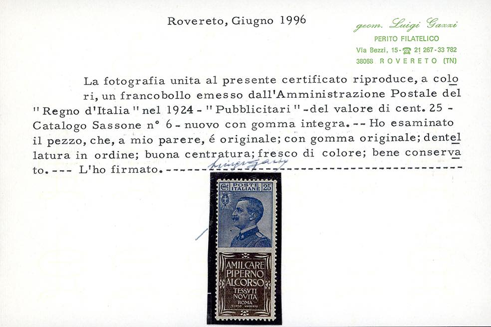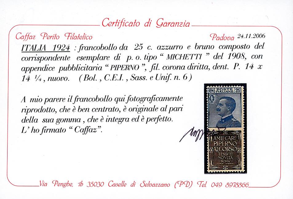 1924 - 25 cent. Piperno (6), nuovo, gomma originale integra, perfetto. Molto fresco e ben centrato. Raro di questa qualità. Cert. L.Gazzi e Caffaz.