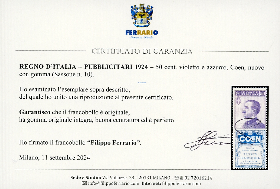 1924 - 50 cent. Coen (10), buona centratura, gomma originale integra, perfetto. Centratura nettamente sopra la media. Cert. Ferrario (cat.Sassone € 6.500/13.000).