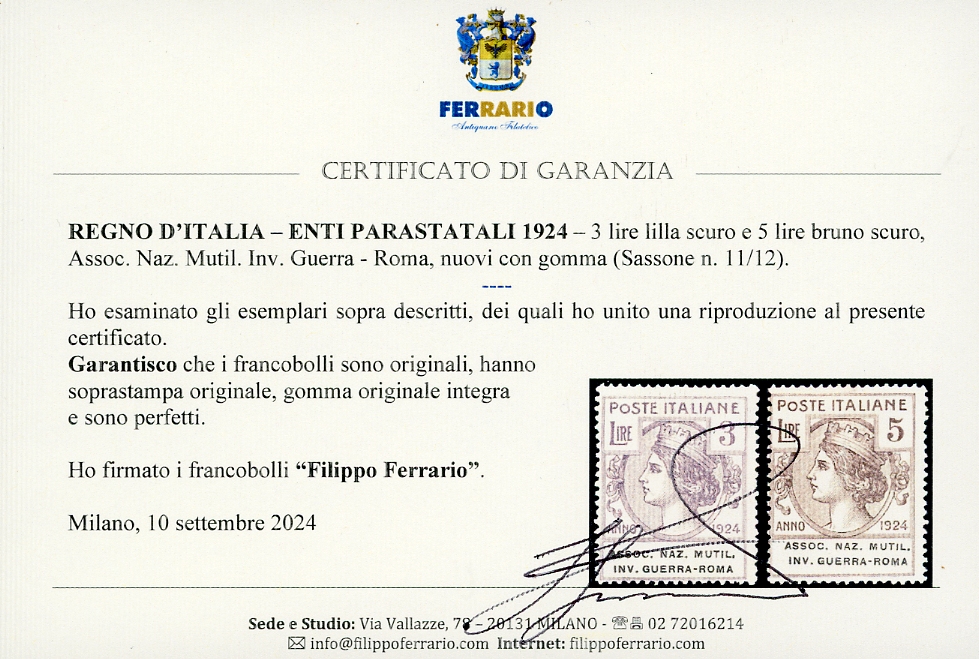 ASSOC.NAZ.MUTIL.INV.GUERRA-ROMA 1924 - Serie completa (5/12), gomma originale integra, perfetti. Molto freschi. Cert. Diena e Ferrario per i due alti valori.