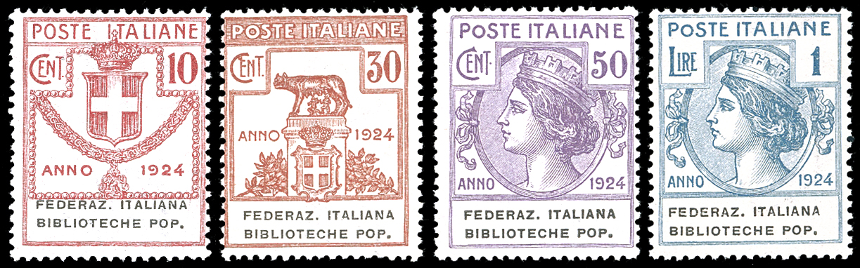 FEDERAZ.ITALIANA BIBLIOTECHE POP. 1924 - Serie completa (34/37), gomma originale integra, perfetti e di ottima qualità. Ferrario.