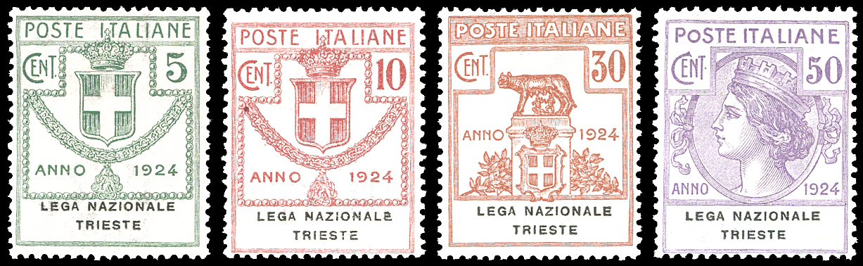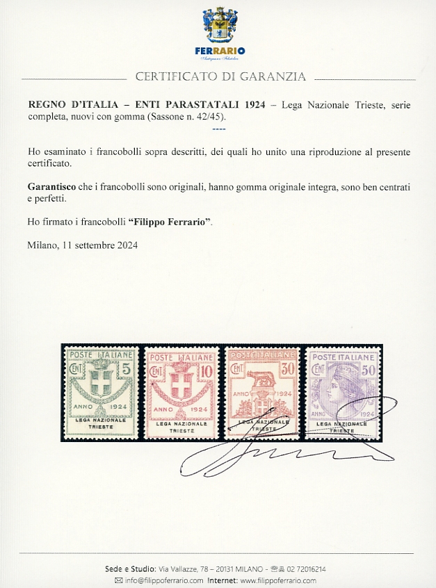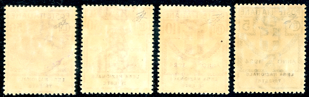 LEGA NAZIONALE TRIESTE 1924 - Serie completa (42/45), buona centratura, gomma originale integra, perfetti. Cert. Ferrario.