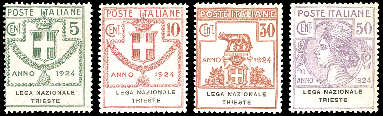 LEGA NAZIONALE TRIESTE 1924 - Serie completa (42/45), ottima centratura per l'alto valore, gomma originale integra, perfetti. Cert. Diena (cat.Sassone € 4.500/9.000).