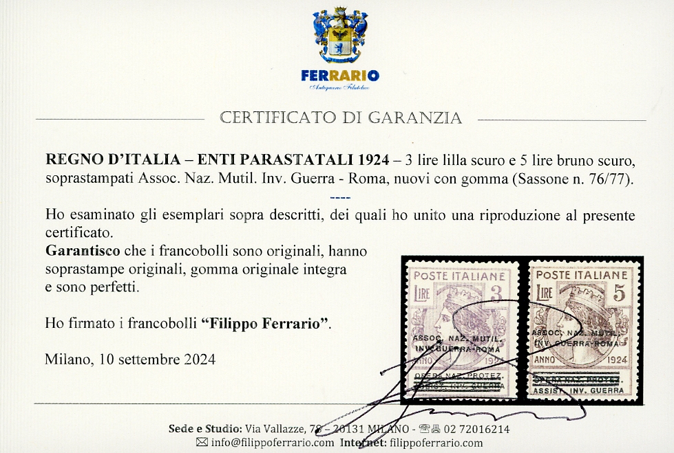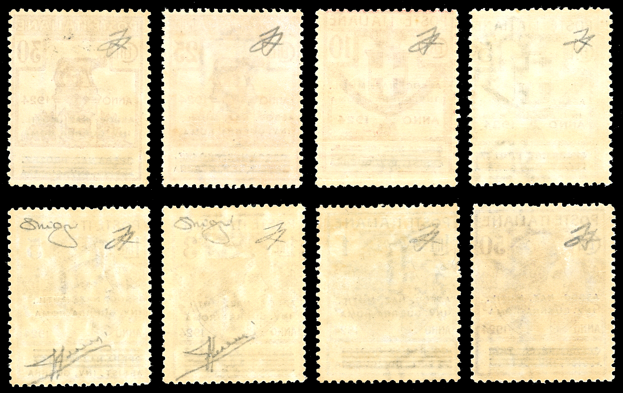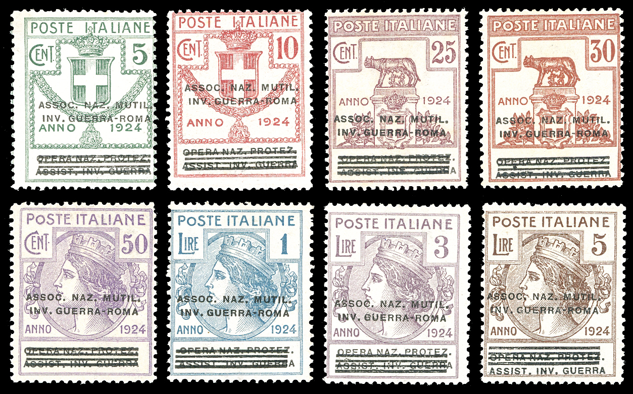 ASSOC.NAZ.MUTIL.INV.GUERRA-ROMA 1924 - Soprastampati, serie completa (70/77), gomma originale integra, perfetti. Rari e di ottima qualità. Alti valori Raybaudi e cert. Sorani e Ferrario.