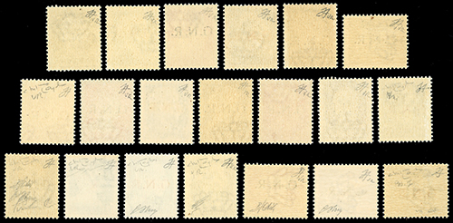 1944 - Soprastampati G.N.R., tiratura di Verona, serie completa (470/489), nuovi, gomma originale integra, perfetti. Molto belli, alti valori ottimamente centrati e firmati G.Oliva e Raybaudi. Cert. Ferrario per la serie.