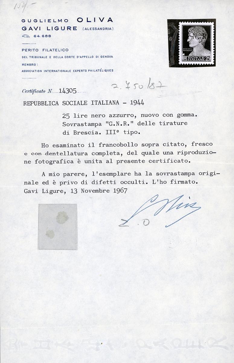 1943 - 25 lire soprastampa G.N.R. del III tipo di Brescia (488/III), nuovo, gomma originale integra, perfetto. Splendido e molto raro. Pochi esemplari esistenti. Fiecchi, cert. G.Oliva, Andreoni (che lo riporta come gomma originale), Ferrario.