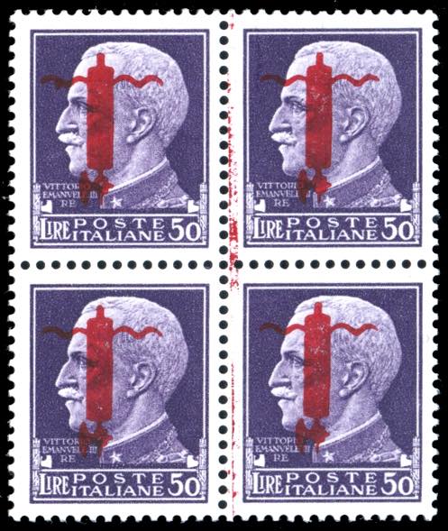 1944 - 50 lire, soprastampa fascio in rossa capovolta, emissione di Verona (501a), blocco di quattro, spazio tipografico al centro, gomma ... Leggi tutto